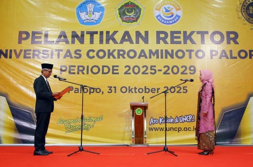 Palopo.metro-pendidikan.com. Universitas Cokroaminoto Palopo (UNCP) resmi memasuki babak baru kepemimpinan setelah dilantiknya Dr. Sri Hastuty Saruman SE M.Pd sebagai rektor periode 2025-2029. Pelantikan bersejarah ini dilaksanakan pada Jumat, 31 Oktober 2025, bertempat di Gedung Saodenrae Convention Center (SCC) dan dipimpin langsung oleh Ketua Yayasan Perguruan Tinggi Cokroaminoto Palopo, Awaluddin Saruman, ST.