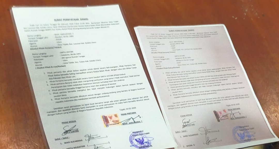 Aparat Desa Tojabi, Syarif membenarkan bahwa telah mengeluarkan dua lembar Surat Pernyataan Damai antara Sinta dan Hamsur pada tanggal 03/02/2026 dalam waktu yang berbeda.