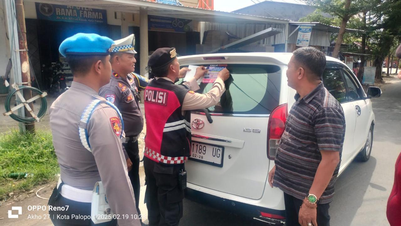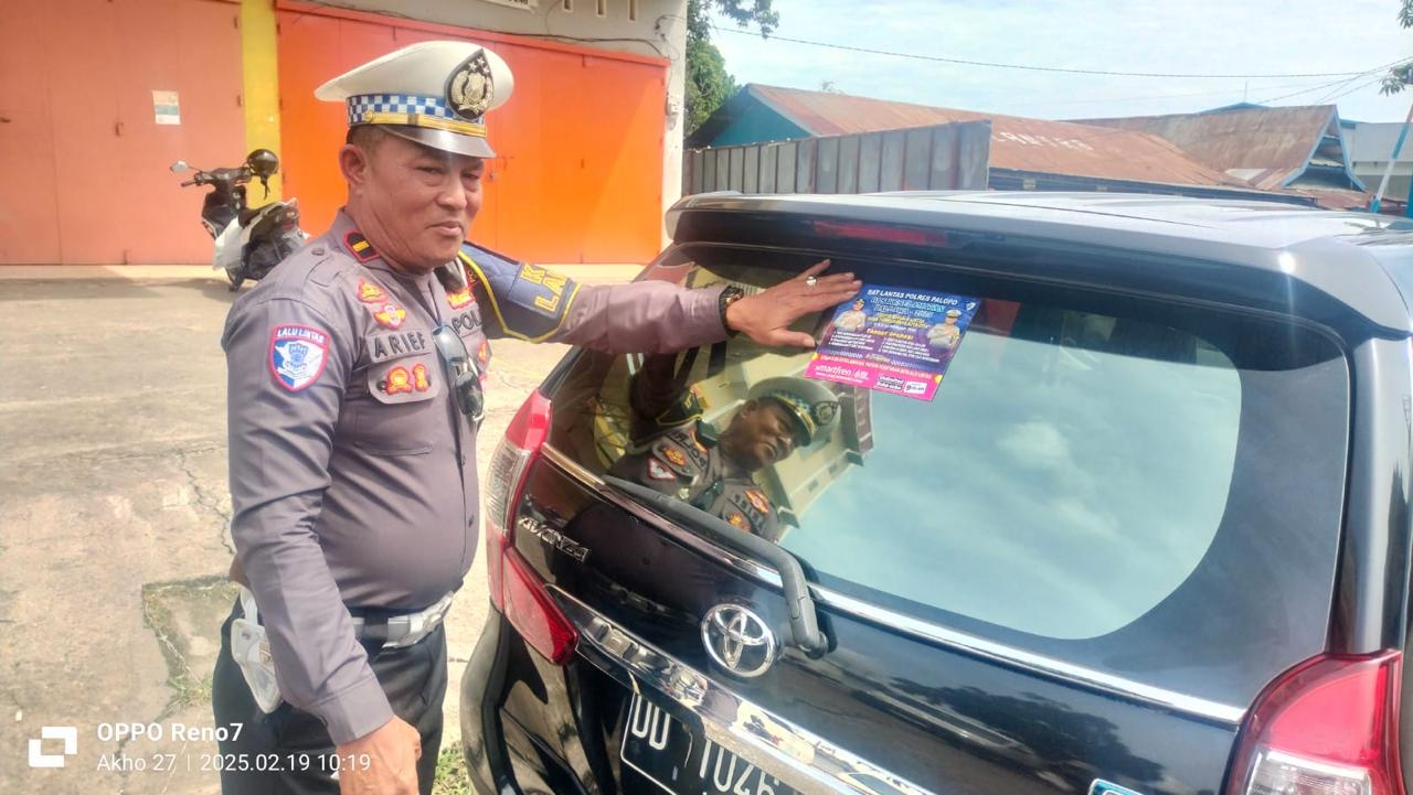Melaksanakan Giat Sosialisasi Tentang Operasi Keselamatan Pallawa-2025 ke Pengguna jalan dengan Spanduk; Pemasangan Stiker Operasi Keselamatan Pallawa2025 ke Pengguna jalan yang melintas baik minibus maupun mobil truck.