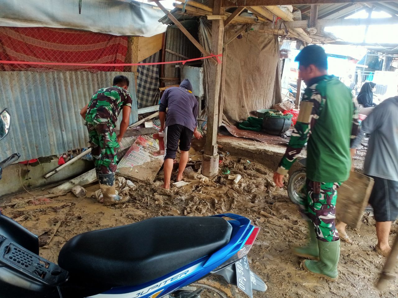 Bukan cuma Babinsa yang turun langsung membersihkan pasar, tapi petugas pasar, Satpol PP dan warga sekitar ikut membantu dalam pembenahan dan pembersihan pasar tersebut.