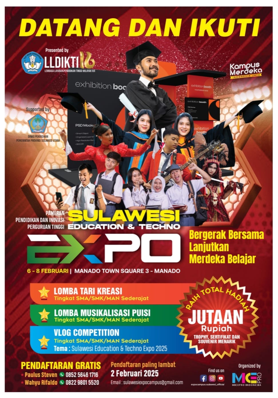Dijelaskan, expo kali ini akan diselingi dengan beragam lomba tingkat SLTA di antaranya; lomba tari kreasi, lomba musikalisasi puisi serta vlog competition dengan tema vlog, Sulawesi Education & Techno Expo 2025.