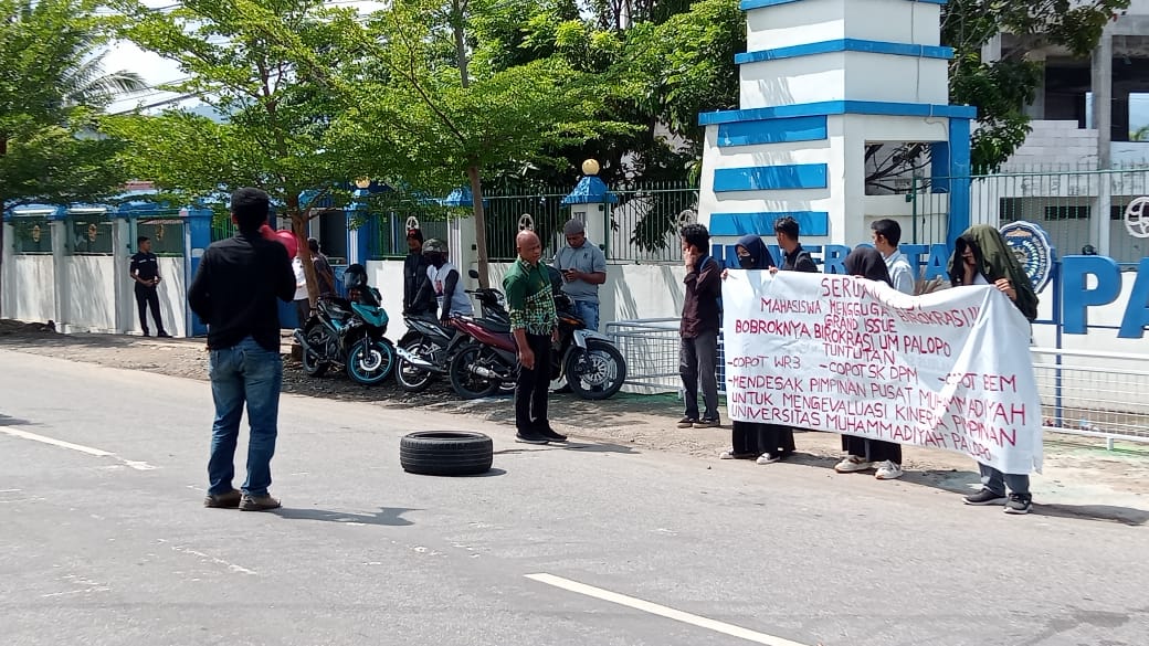 Palopo-metro-pendidikan.com. Aksi unjuk rasa berjumlah sekitar 20 orang yang dilakukan oleh Aliansi Mahasiswa dan Birokrasi Universitas Muhammadiyah Palopo, Senin (27/11) kemarin menggugat pimpinan kampus khususnya Wakil Rektor III Universitas Muhammadiyah Palopo dengan mengajukan tiga tuntutan.