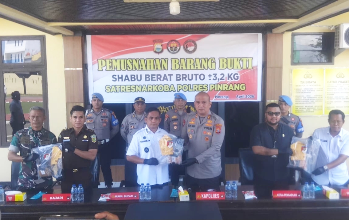 Pinrang.metro-pendidikan.com. Kepolisian Resor (Polres) Pinrang kembali menunjukkan komitmennya dalam memerangi peredaran gelap narkotika. Dipimpin langsung oleh Kapolres Pinrang, AKBP Edy Sabhara Manggabarani, S.I.K., jajaran Polres Pinrang memusnahkan barang bukti sabu seberat 3,2 Kilogram di halaman Markas Polres Pinrang pada Rabu (15/04/2026).