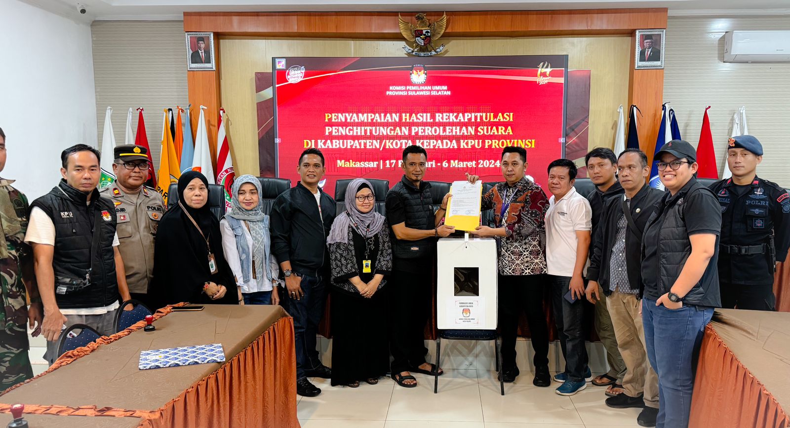 Sekitar pukul 09.14 Wita Hasil Rekapitulasi Suara tiba di Kantor KPU Provinsi Sulsel Jl. A. P. Pettarani, Kota Makassar yang diserahkan oleh Ketua KPU dan diterima Kasubag Teknis KPU Sulsel, Muhammad Saleh Mahir. **