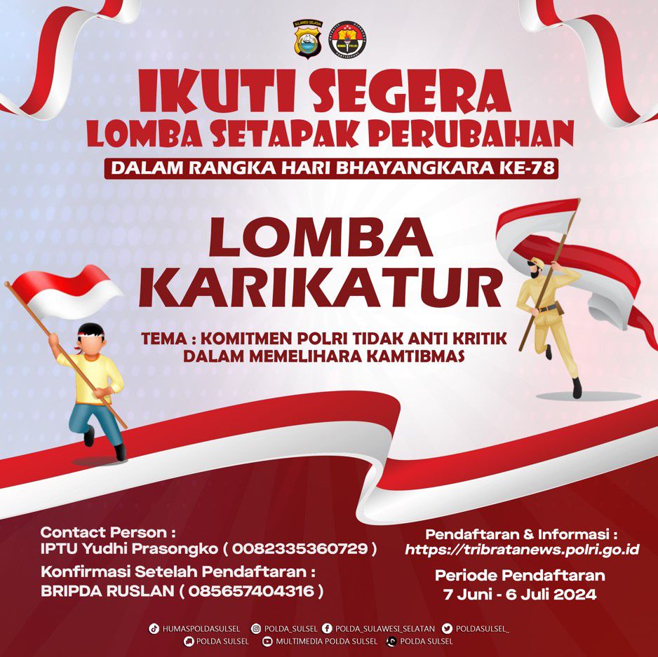 Pendaftaran lomba Setapak “Perubahan” bisa diakses di website https://tribratanews.polri.go.id/, tanpa dipungut biaya apapun, dan informasi berbagai lomba di instagram, fhacebook dan media sosial Polda Sulawesi Selatan.