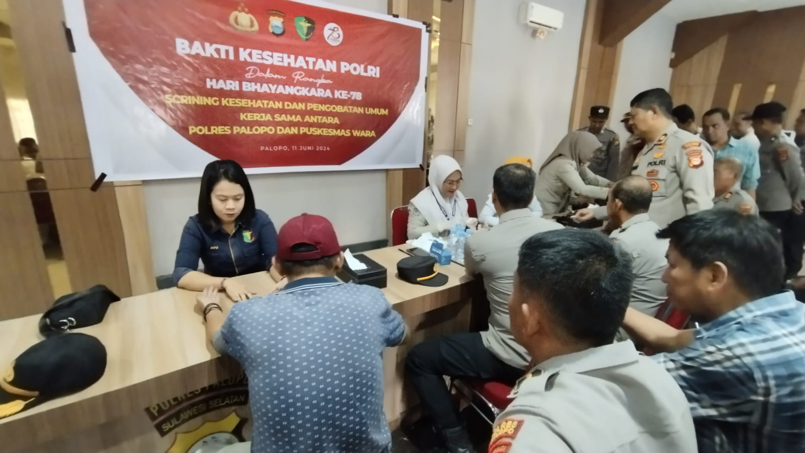 Palopo-metro-pendidikan.com. Menyambut peringatan Hari Ulang Tahun (HUT) Bhayangkara ke-78, Polres Palopo menggelar Bakti kesehatan. Kegiatan ini berlangsung di Aula Tantya Sudirajati Polres Palopo, Selasa (11/6/2024).