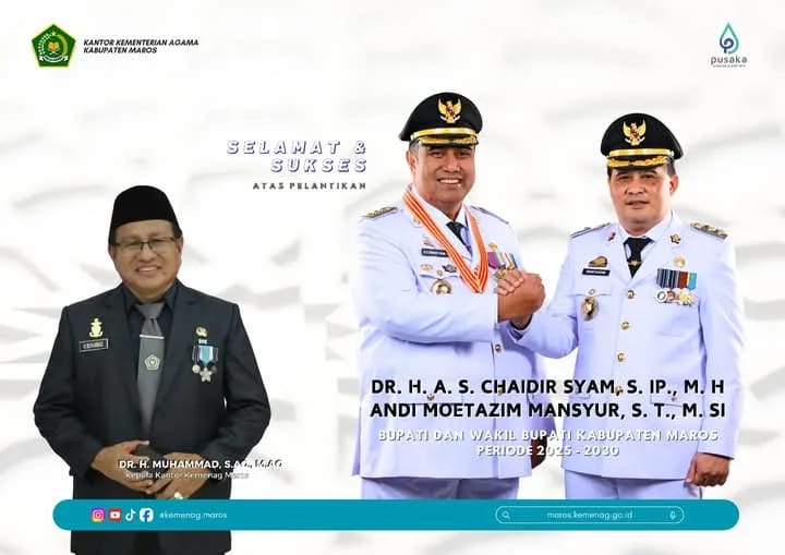 Seperti dilansir Mediasahabat.com, Kepala Kementerian Agama Kabupaten Maros, Dr. H. Muhammad, S.Ag., MM, bahkan satu diantara pejabat di daerah tersebut ikut menyampaikan ucapan selamat dan sukses kepada Bupati Maros, Chaidir Syam dan Wakil Bupati Maros, Muetazim Mansyur periode 2025-2030.