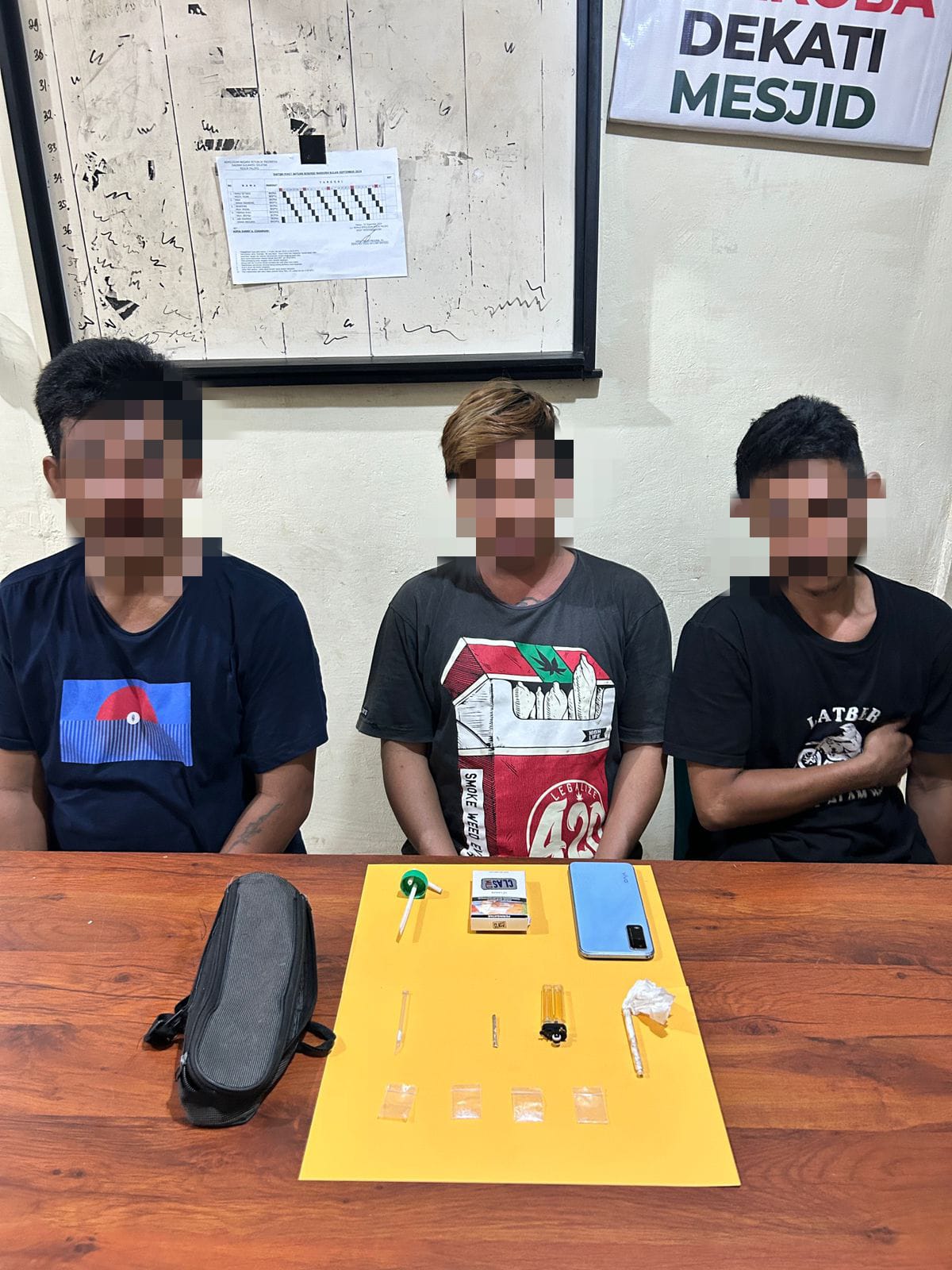 terhadap tiga terduga pelaku natkoba. Meteka tanpa hak atau melawan hukum memiliki, menyimpan, menguasai, membeli, menerima, Narkotika Golongan 1 jenis sabu, Minggu (22/9/2024).