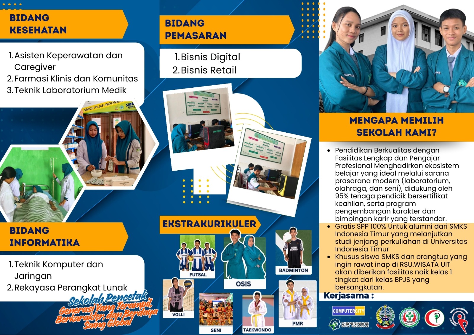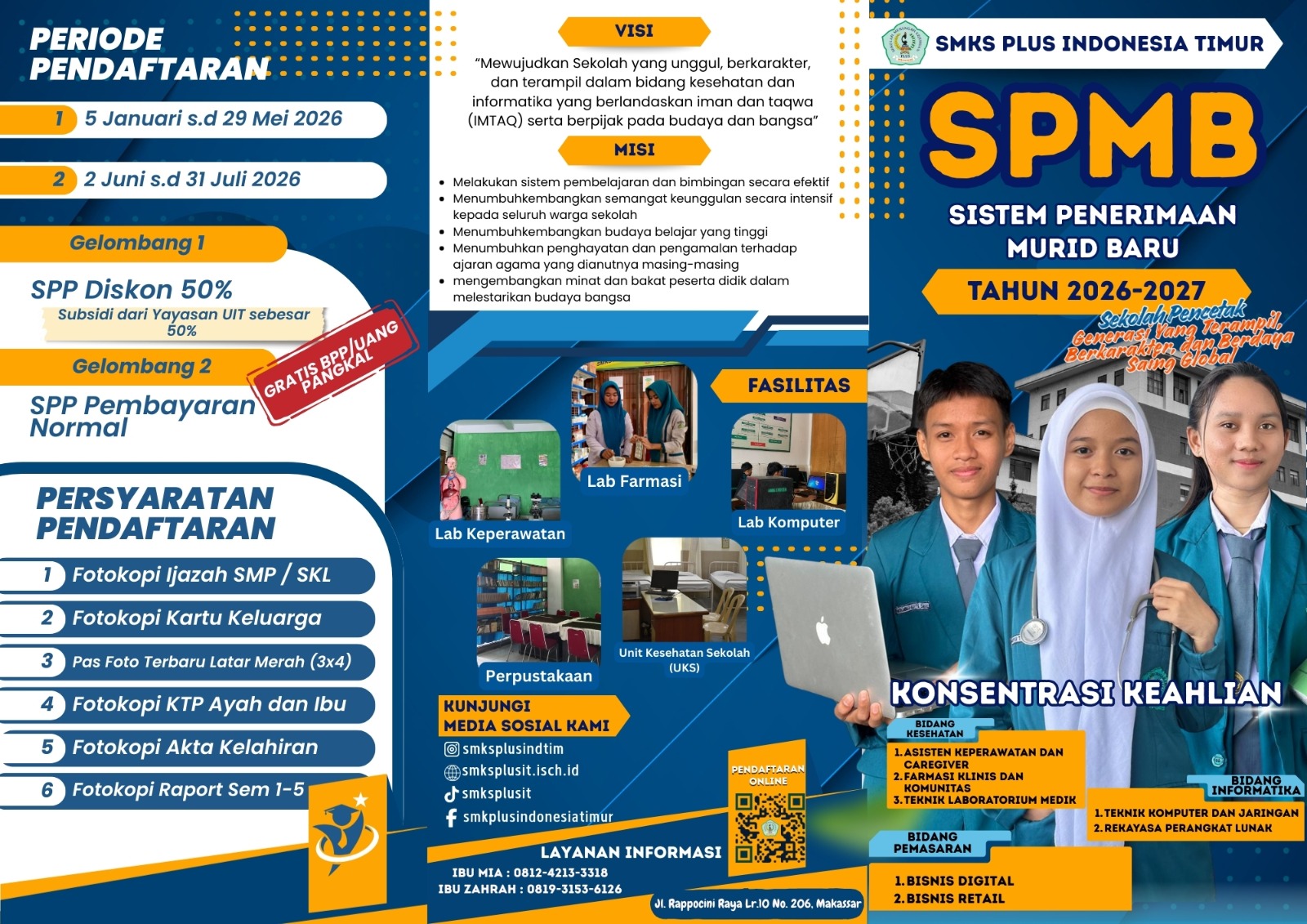 Makassar.metro-pendidikan.com. Sekolah Menengah Kejuruan (SMK) Plus Indonesia Timur dibawah binaan Yayasan Indonesia Timur) Makassar, Sulawesi Selatan, berlokasi sama dengan Universitas Indonesia Timur (UIT), Jl Rappocini Raya Makassar. Selain mengemban misi sosial, juga membuka akses pendidikan yang berkualitas. Bahkan, SMP Plus siap menjadi feeder bagi dunia industri dan perguruan tinggi yang ada di Sulsel khususnya UIT sebagai rumah besar bagi satuan pendidikan tersebut