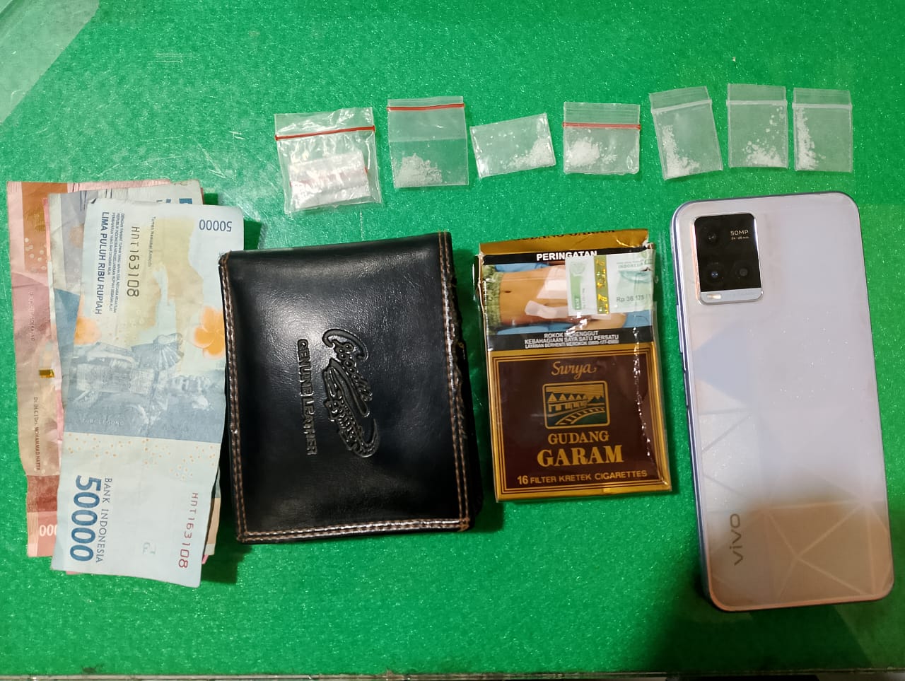 Dari tangan tersangka, polisi menemukan tujuh sachet sabu. Satu sachet disembunyikan dalam bungkus rokok merek Gudang Garam, sementara enam lainnya ditemukan dalam dompet milik tersangka. Selain itu, barang bukti lain yang disita adalah sebuah ponsel Vivo warna putih, uang tunai Rp300.000, dan sebuah dompet hitam.