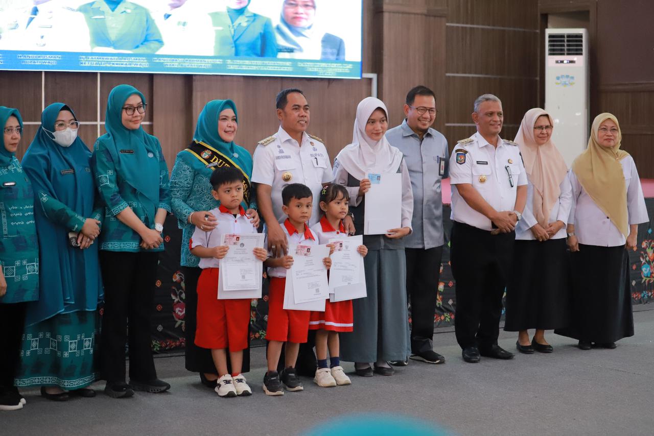 Pada kesempatan itu, Bupati Wajo Andi Rosman didamping Ketua TP PKK Fatmawati menyerahkan secara simbolis Akte Kelahiran dan KIA kepada perwakilan anak.