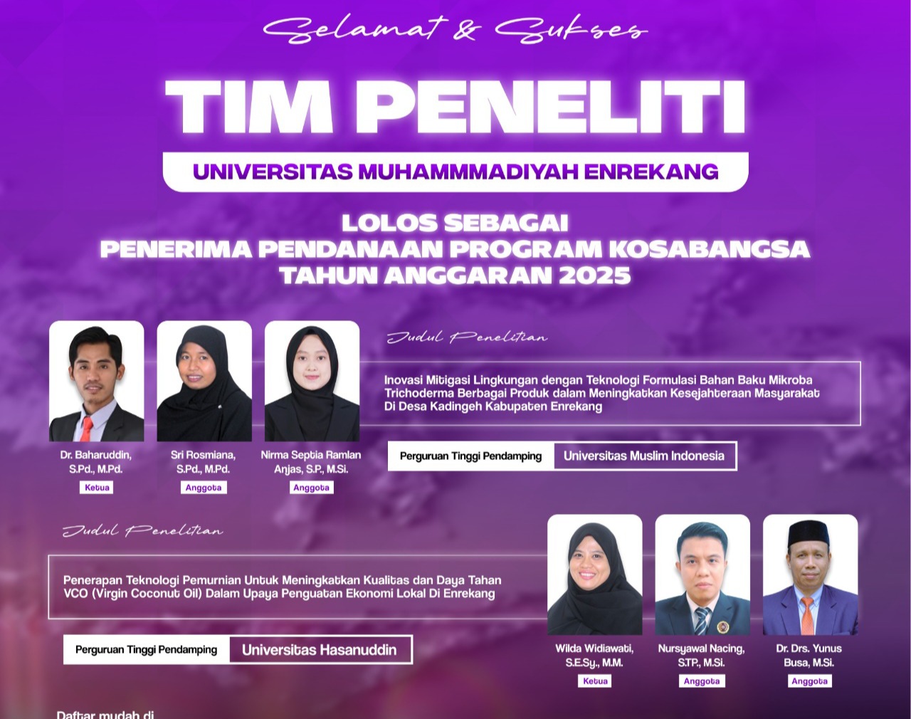 Dua tim peneliti yang terdiri dari 6 orang dosen UNIMEN berhasil mencatatkan namanya sebagai Penerima Pendanaan Program Kosabangsa Tahun Anggaran 2025 bersama 116 tim lainnya dari perguruan tinggi se Indonesia.