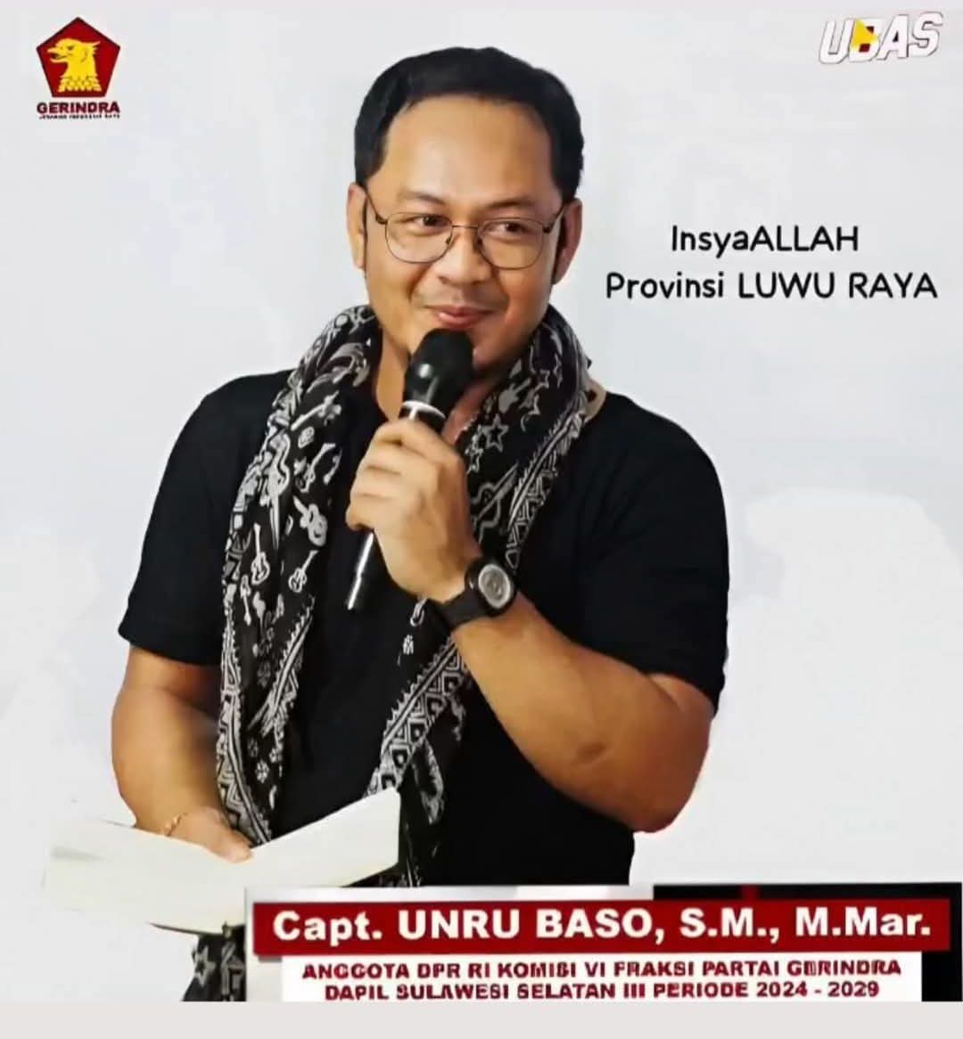 Luwu Raya.metro-pendidikan.com. Jagat media sosial di wilayah Sulawesi Selatan kembali dihebohkan dengan beredarnya poster legislator pusat dari Fraksi Gerindra, Capt. Unru Baso (Ubas). Foto tersebut menarik perhatian publik karena disertai narasi tegas: “Insya ALLAH Provinsi LUWU RAYA”.