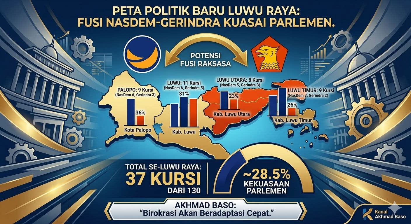 Palopo.metro-pendidikan.com. Wacana penggabungan atau fusi antara Partai NasDem dan Partai Gerindra di tingkat nasional diprediksi akan ikut mengubah konstelasi politik di daerah, khususnya di Luwu Raya. Bahkan, menjadi “tsunami politik” bagi wilayah Tana Luwu yang kini menguasai sepertiga kursi di parlemen dari Dapil Luwu Raya.