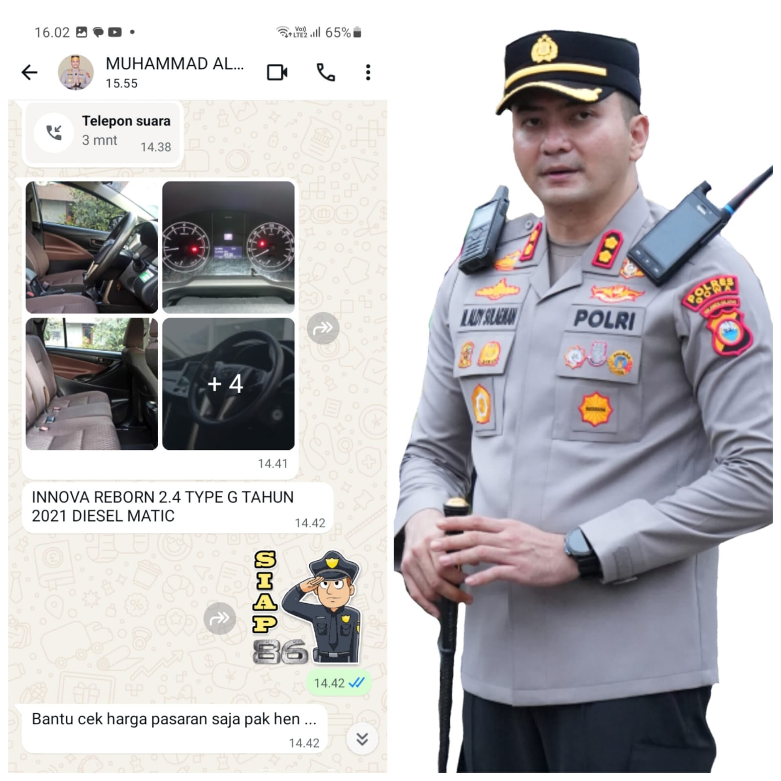 Pelaku bahkan mengirimkan foto kendaraan berupa Toyota Reborn 2.4 tipe G tahun 2021 diesel matic yang ditawarkan dengan harga Rp180 juta lengkap dengan dokumen.