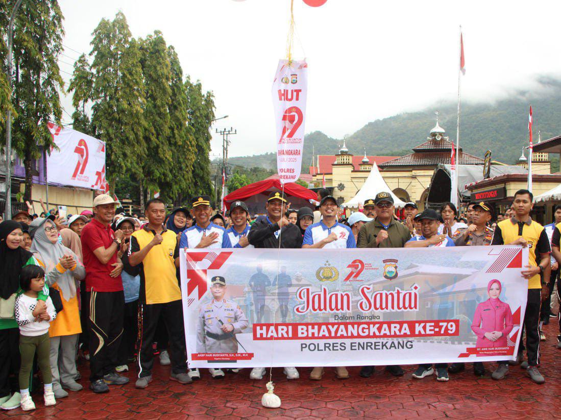 Enrekang, metro-pendidikan.com — Hari Bhayangkara ke-79 di Kabupaten Enrekang berlangsung semarak dan penuh kebersamaan. Salah satu rangkaian utama kegiatan, yakni Jalan Santai dan Senam Bersama, menjadi ajang yang memperlihatkan kekompakan unsur Forum Koordinasi Pimpinan Daerah Enrekang yang hadir dan turut berjalan bersama masyarakat, pada pagi ini dilapangan apel Mapolres. Minggu (29/06/2025)